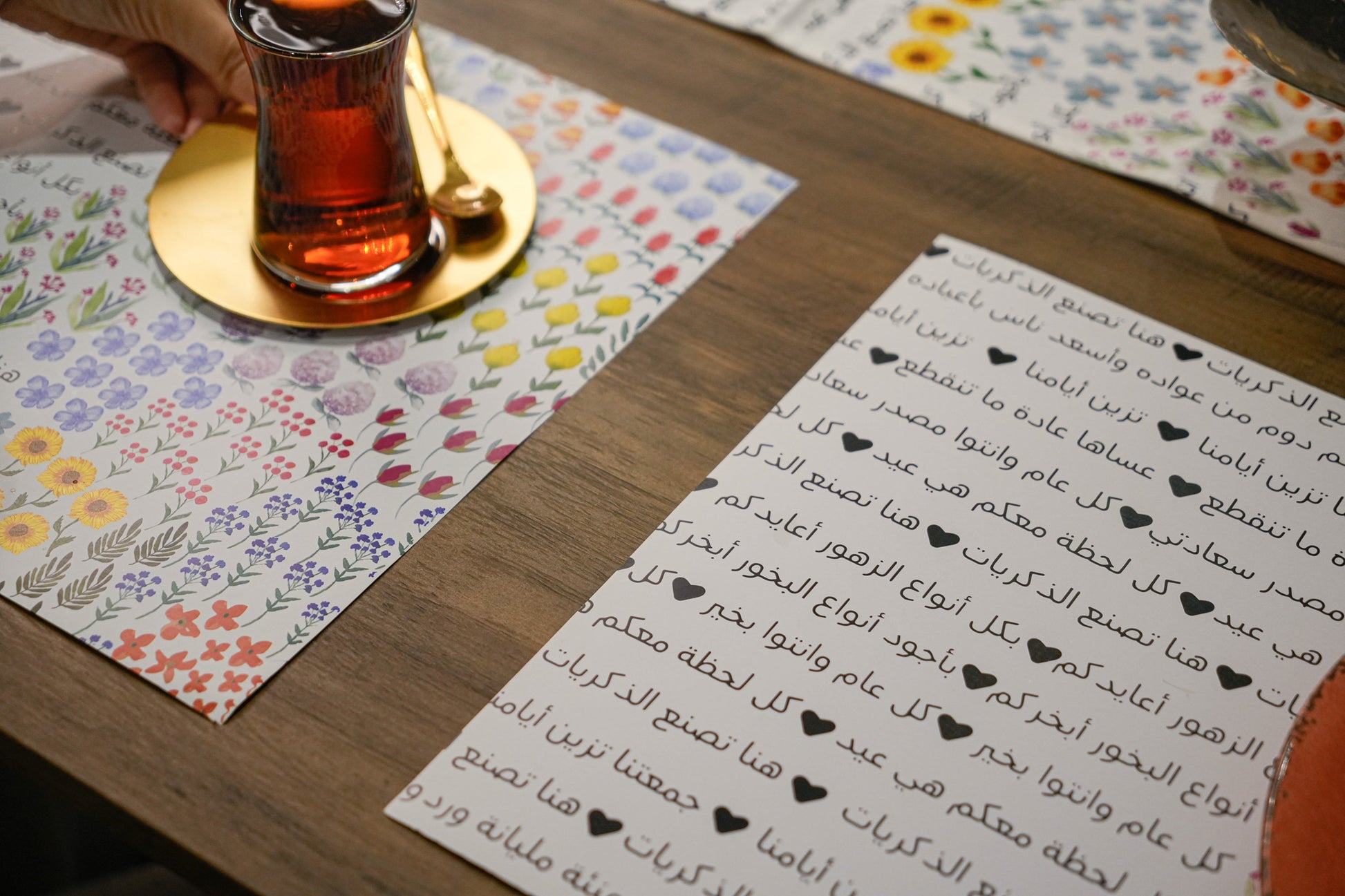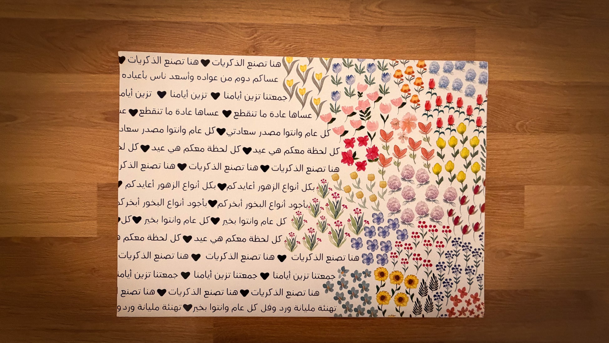 حتى تكمل الطاولة صممت لك معها مفرش طاولة رنر رائع يجعل طاولتك مكان لا ينسى"زيني طاولتك في العيد مع مفرش الصحون الورقي "زهور"، المصمم برسومات زهور مائية وعبارات تهنئة العيد.