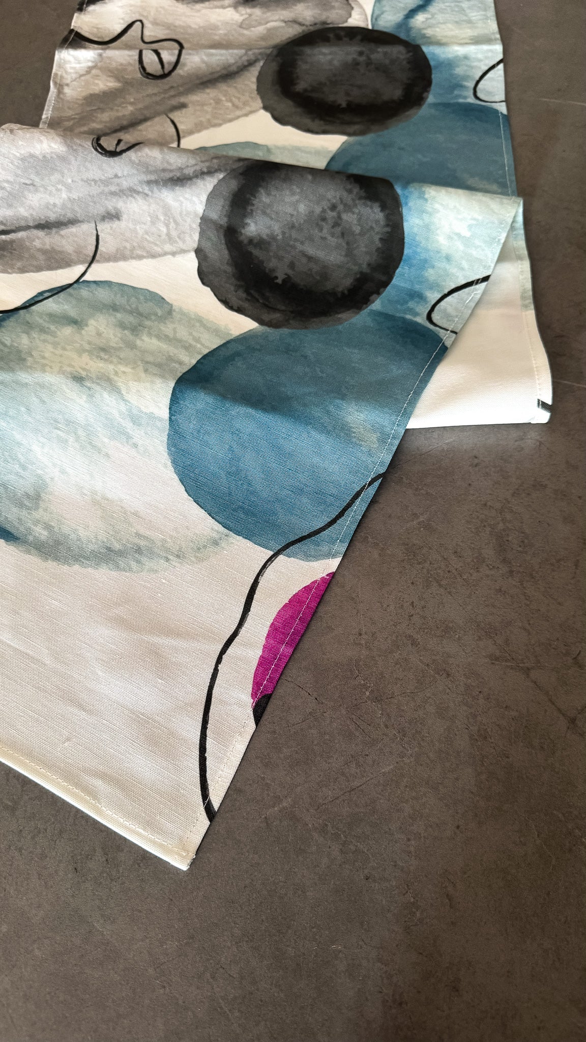 Crafted from premium American linen canvas, the design blends bold circular forms and fluid watercolor shades in blue, grey, and hints of magenta – giving your dining or coffee table a modern, gallery-inspired vibe.