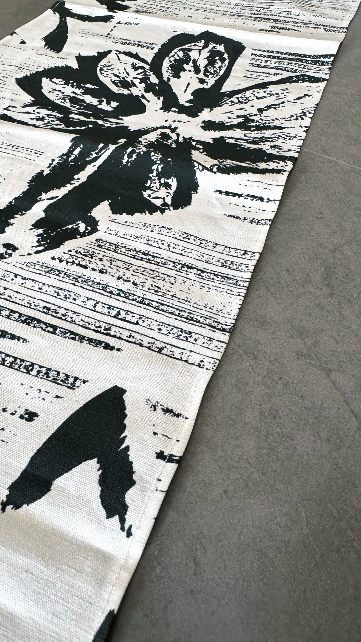 Abstract floral linen canvas runner. Size 200×34 cm. Black and beige modern table runner with GCC delivery.