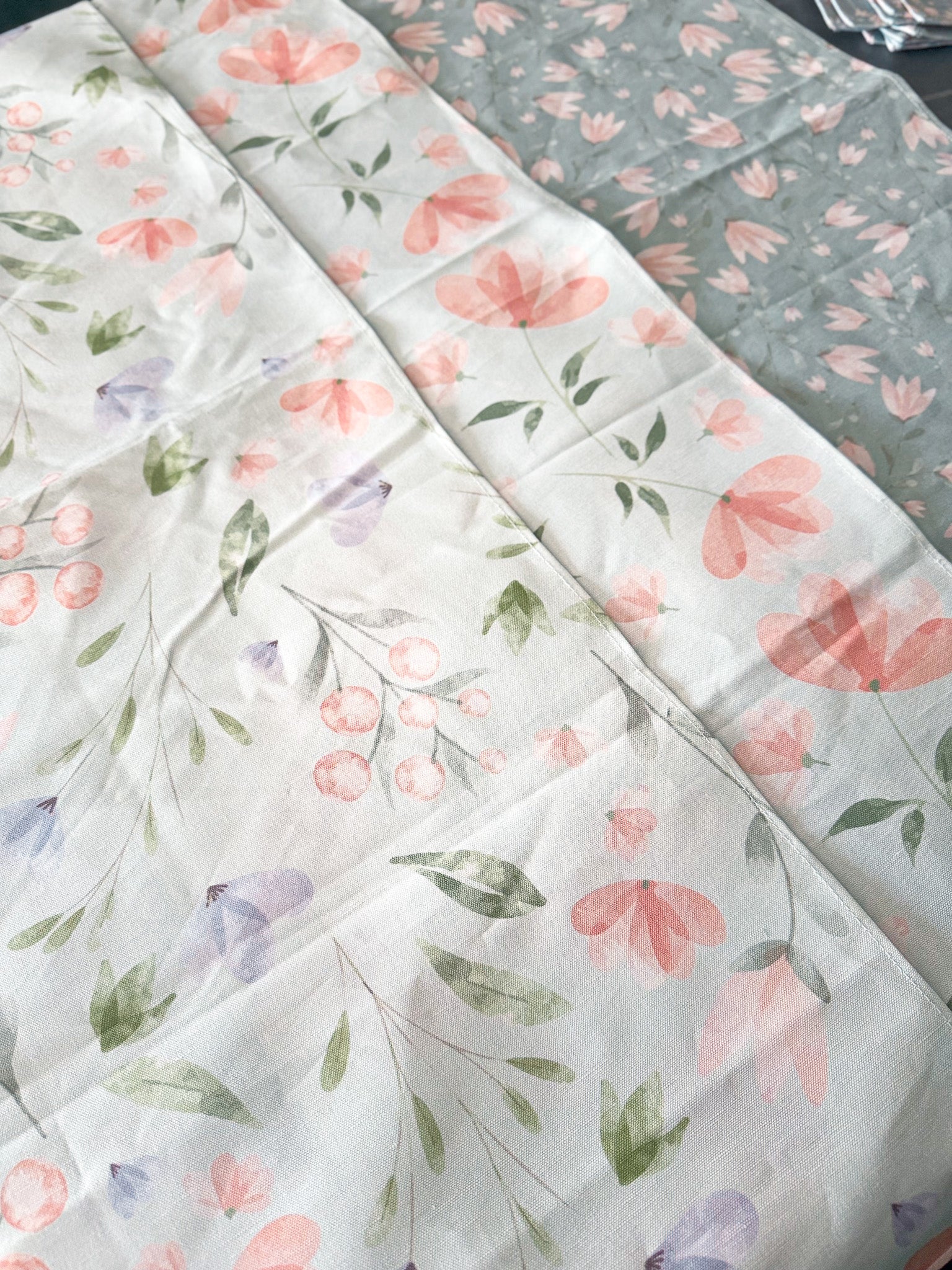 A charming linen canvas runner featuring a mix of watercolor-style florals in soft orange, lilac, and blush tones with fresh green leaves. This delicate design adds a graceful touch to your dining table, coffee corner, or console, bringing the beauty of a spring garden into your home.