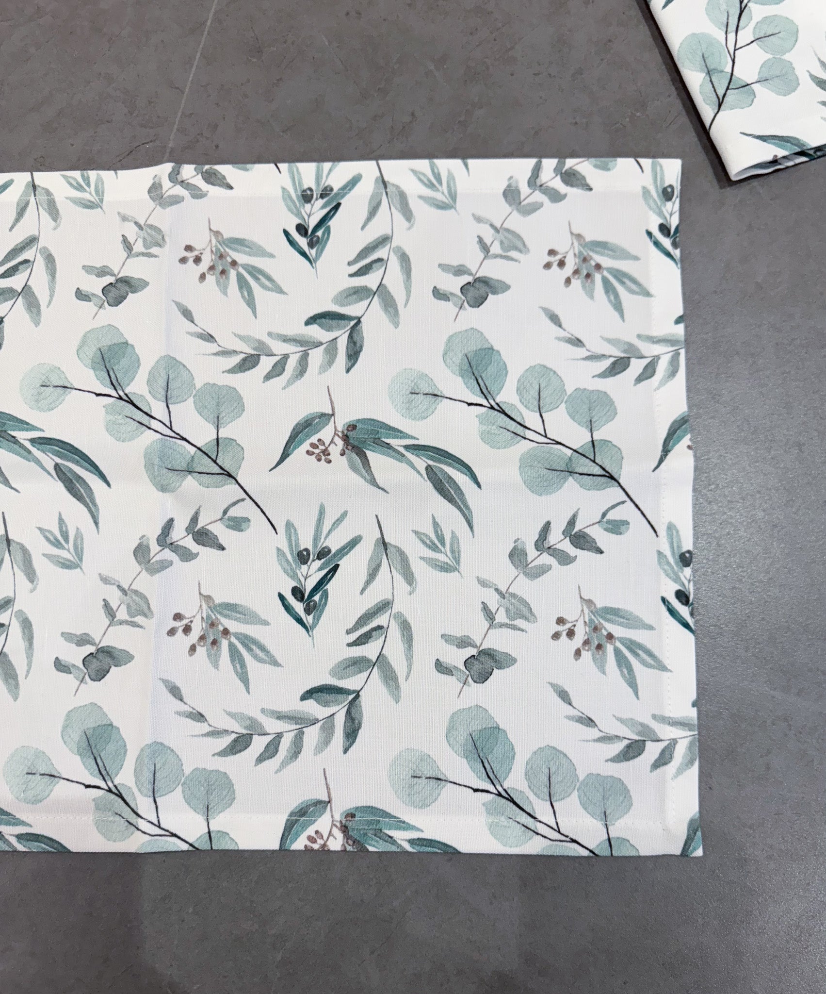 linen-cotton canvas placemats featuring a soft botanical leaf design in calming green and earthy tones. Perfect for everyday dining or special gatherings, these placemats combine natural elegance with durability.